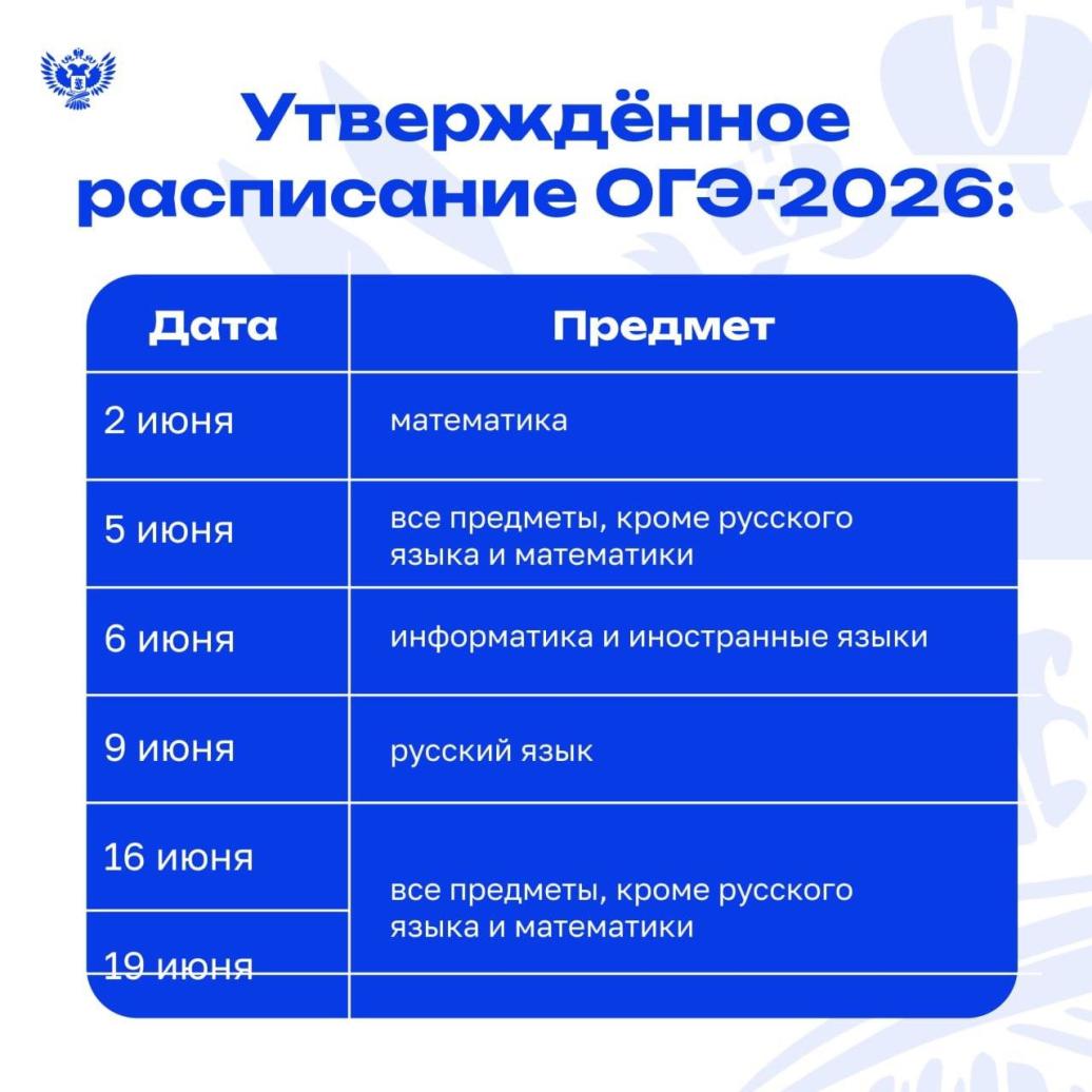 2 июня (вторник) — математика; 5 июня (пятница) — по всем учебным предметам (кроме русского языка и математики); 6 июня (суббота) — иностранные языки (английский, испанский, немецкий, французский), информатика; 9 июня (вторник) — русский язык; 16 июня (вторник) — по всем учебным предметам (кроме русского языка и математики); 19 июня (пятница) — по всем учебным предметам (кроме русского языка и математики). |
